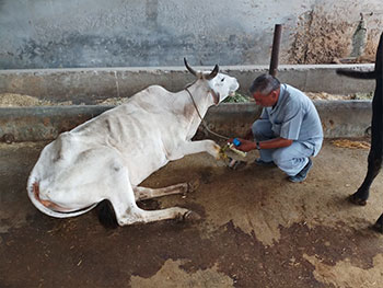 Some of those cows comes in gaushala when they met with accidents. Peoples in our 20 Kilometres surrounded has calls us when they see any cow has met with accident of has injured by the some unsocial elements. After the receiving of information our rescue team immediately reached at the spots and give first aid to cows and take the cow to our Gaushala. Doctor has call up and we give best possible treatment to that cows.